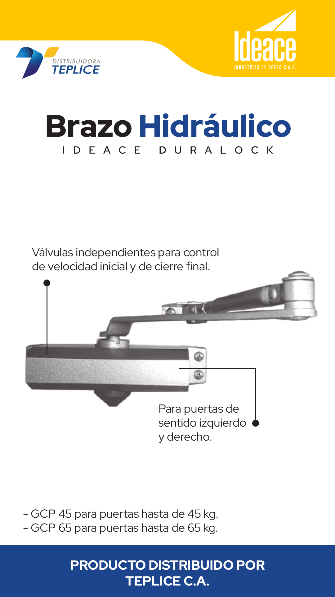 Para puertas de sentido izquierdo y derecho con válvulas independientes para control de velocidad inicial y de cierre final.