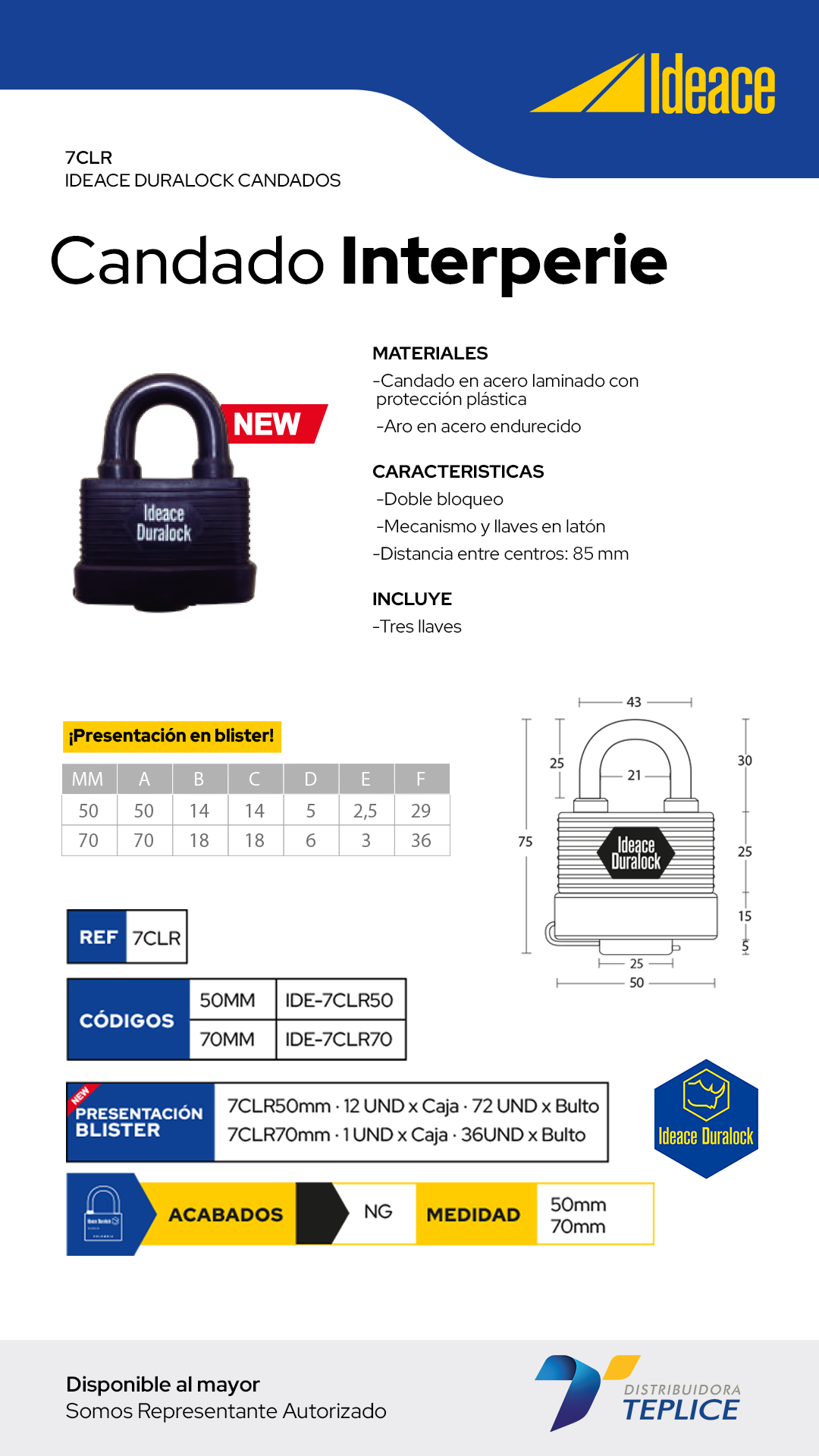 Candado en acero laminado con protección plástica doble bloqueo, aro en acero endurecido y mecanismo con llaves en latón. Incluye tres llaves.