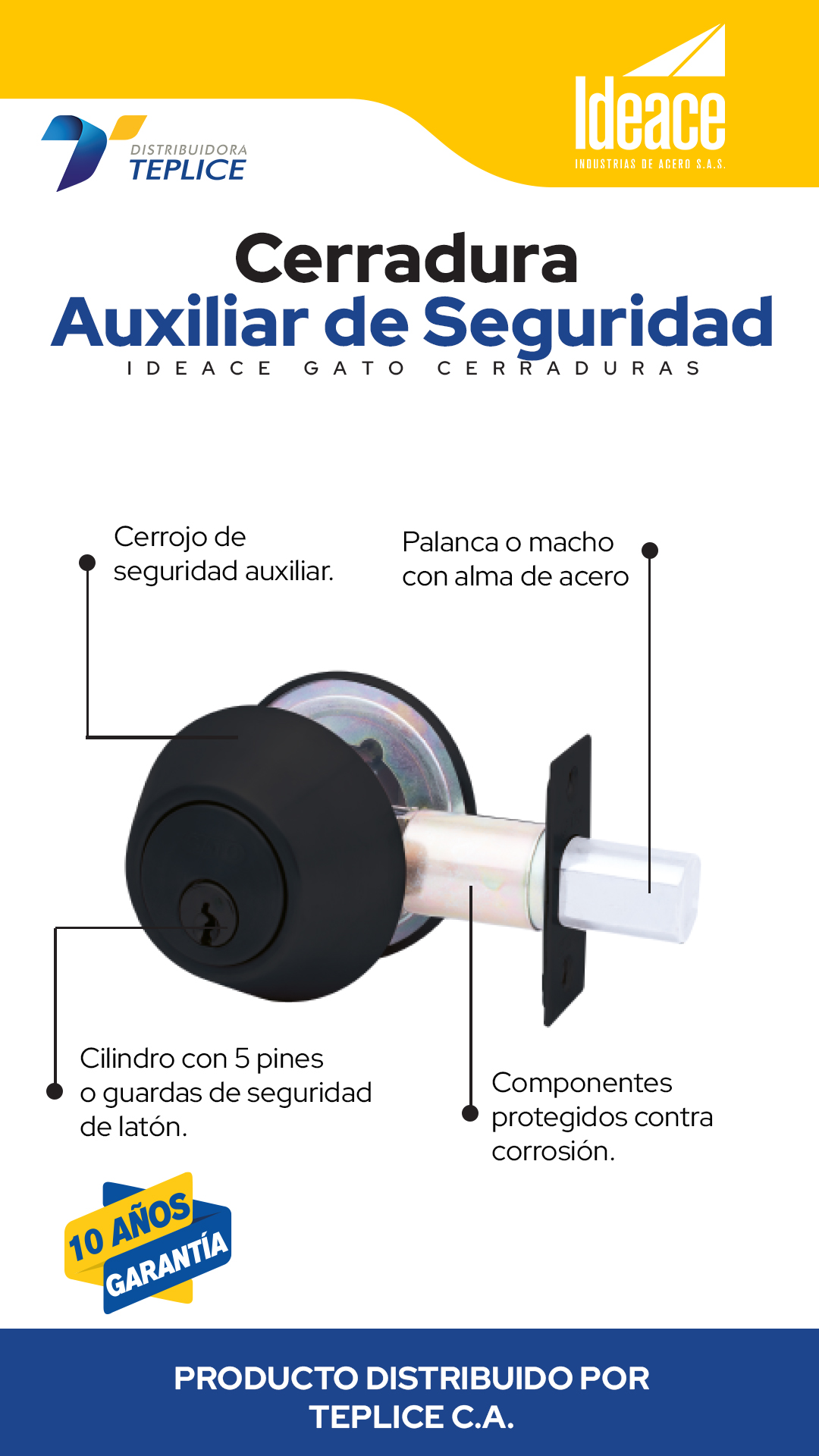 Cerrojo de seguridad auxiliar con palanca o macho con alma de acero, cilindro con 5 pines o guardas de seguridad de latón, componentes protegidos contra corrosión. Incluye tres llaves en latón.