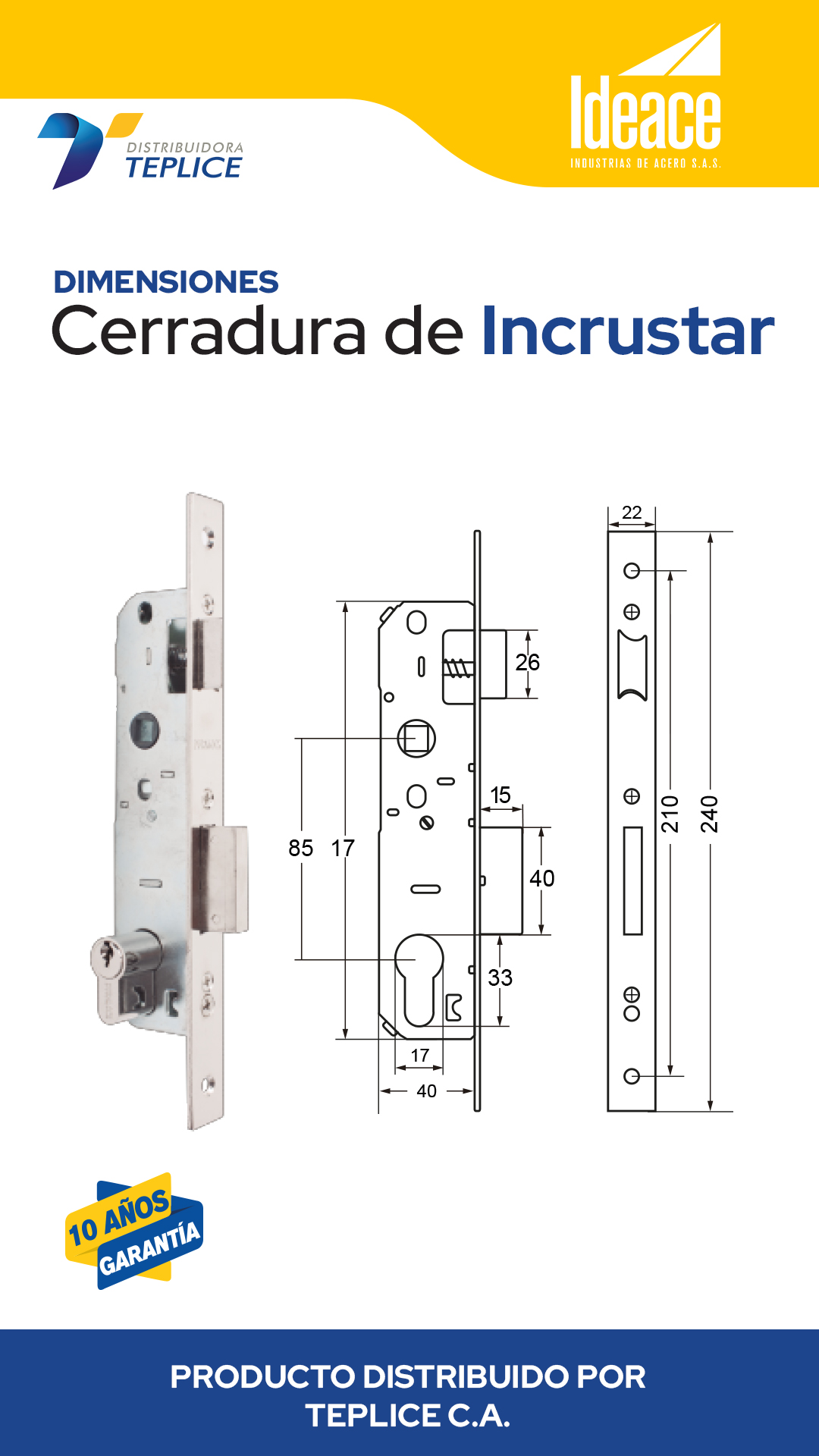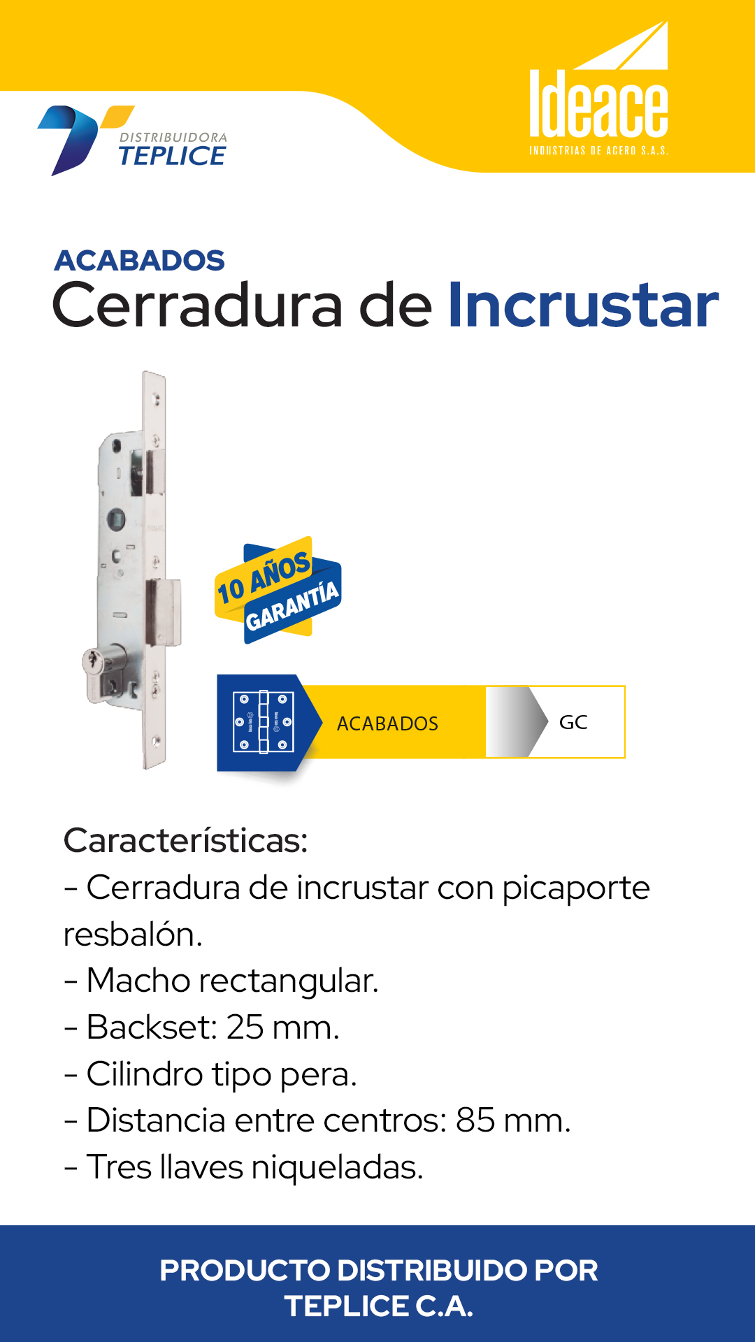 Cerradura de incrustar con picaporte resbalón, macho rectangular, backset de 25 mm, cilindro tipo pera y distancia entre centros de 85mm. Incluye tres llaves niqueladas.