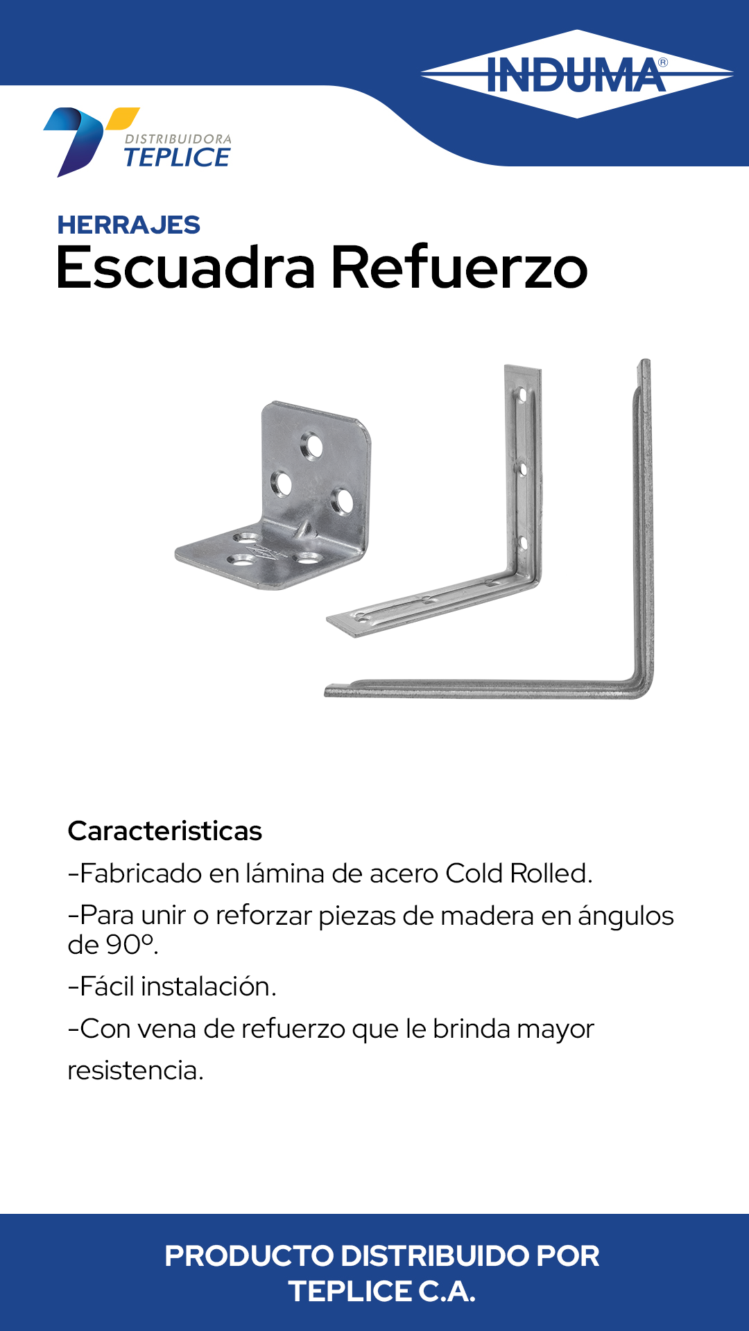La escuadra refuerzo es un accesorio fabricado en lámina de acero Cold Rolled, ideal para unir o reforzar piezas de madera en ángulos de 90 grados. Ofrece una fácil instalación y su diseño incluye una vena de refuerzo que brinda mayor resistencia al producto.