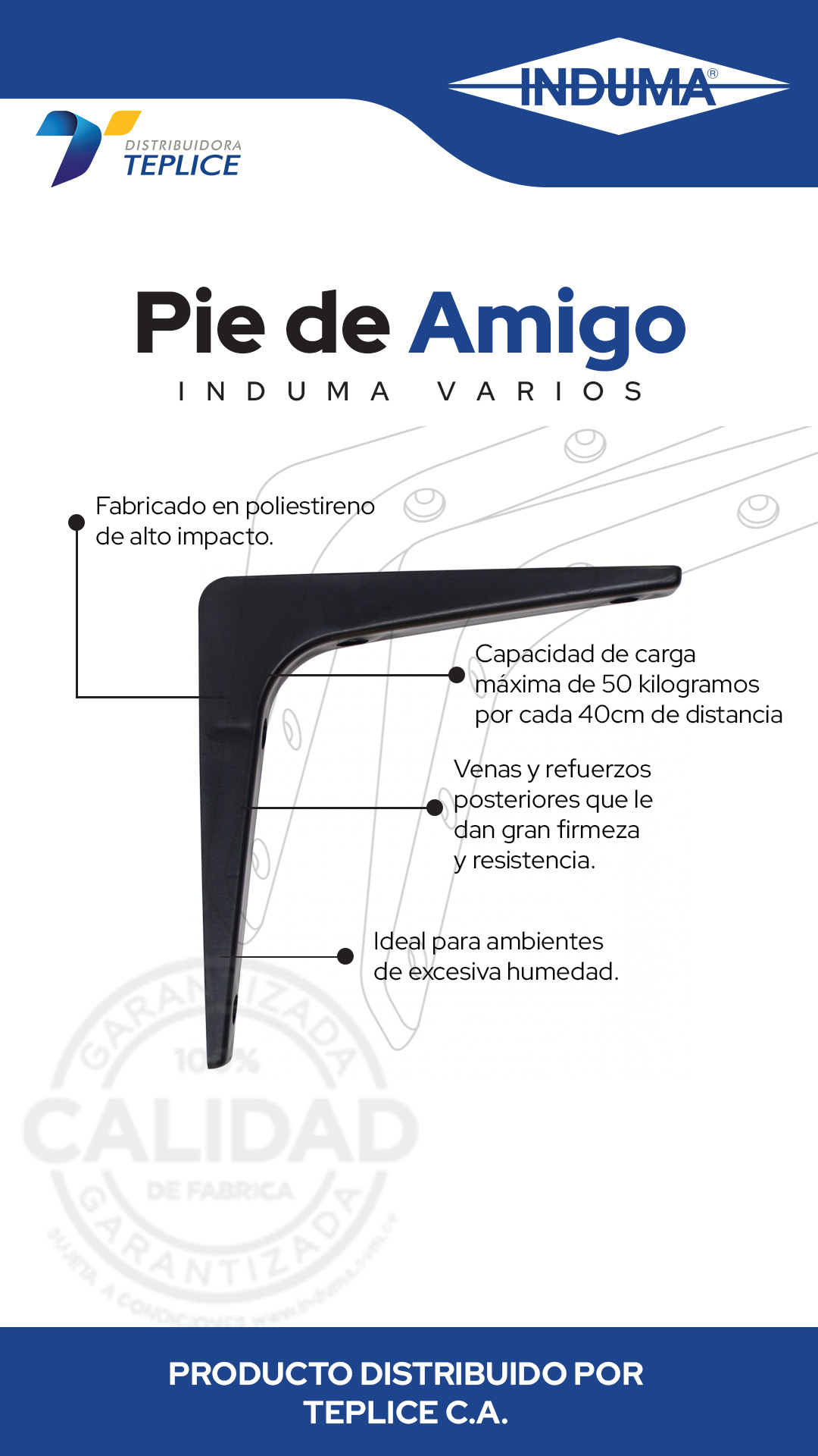 Producto fabricado en Poliestireno de alto impacto con una capacidad de carga máxima de 50 kilogramos por cada 40cm de distancia, ideal para ambientes de excesiva humedad.